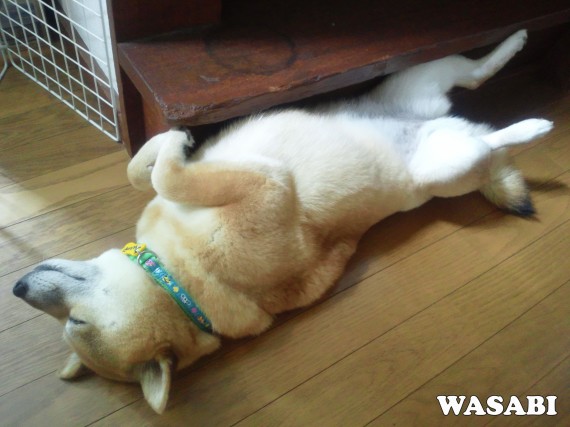 この時期のわさびは、この階段下のフローリングがお気に入り。