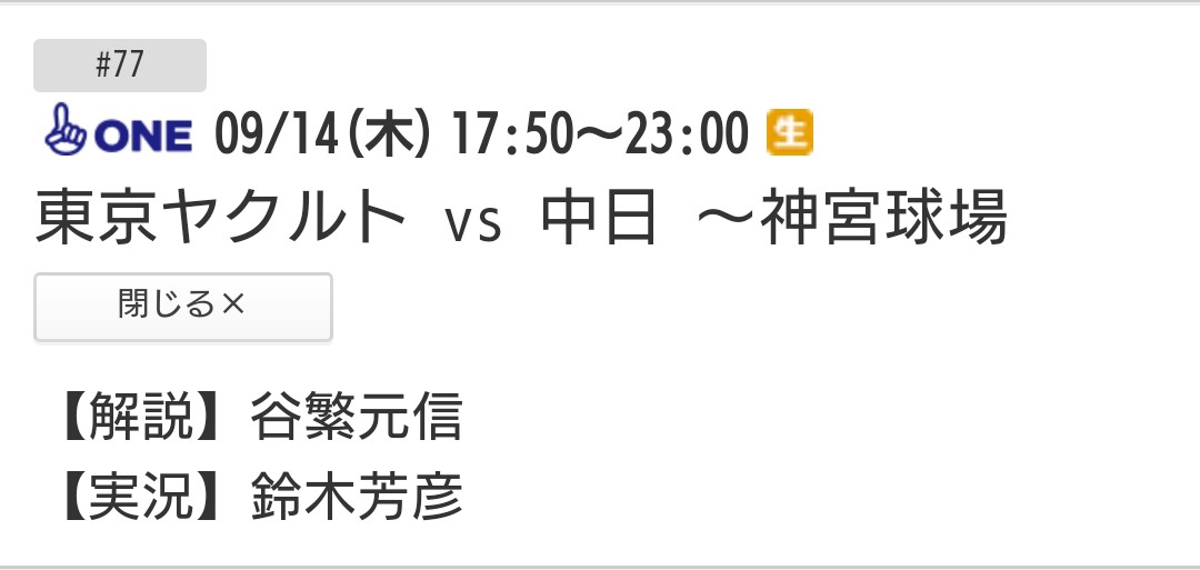 9/14(木) 18:00 ヤクルト 対 中日戦 @明治神宮球場