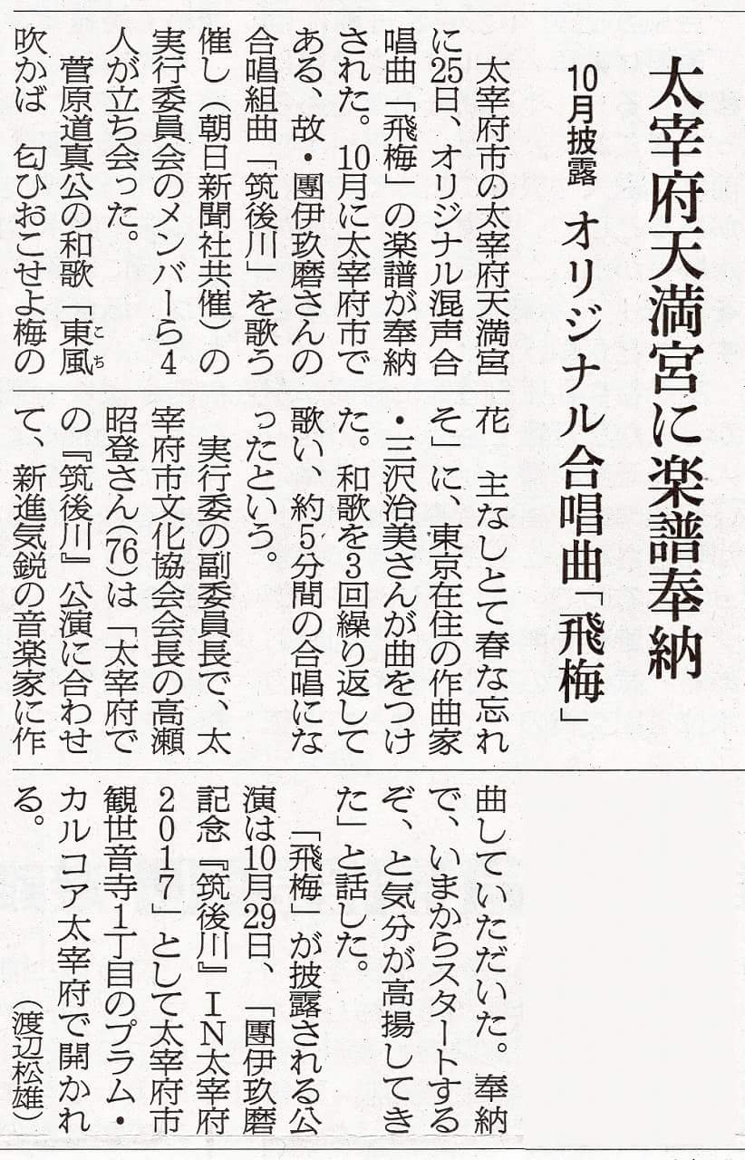 菅原道真公の和歌を混声合唱曲「飛梅」として作曲しました。