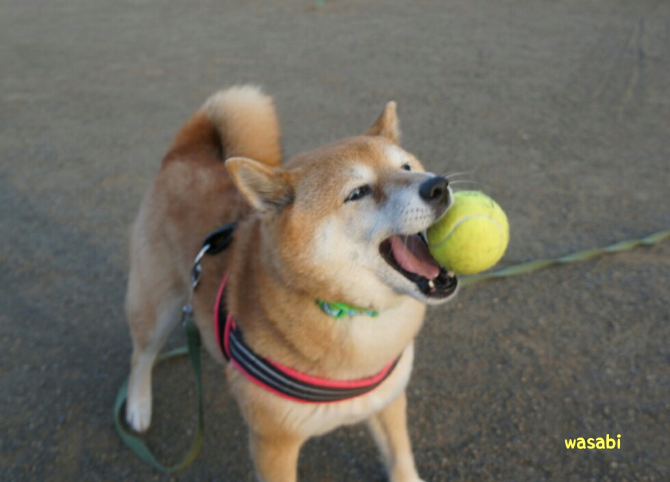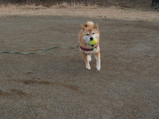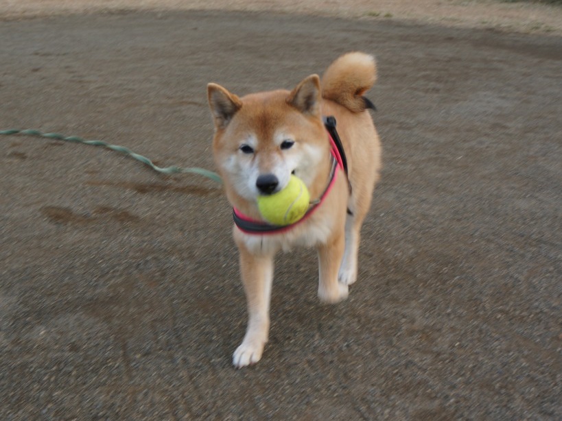 柴犬には、1個が精一杯の野球の硬球を落とさずにがんばってお運び!