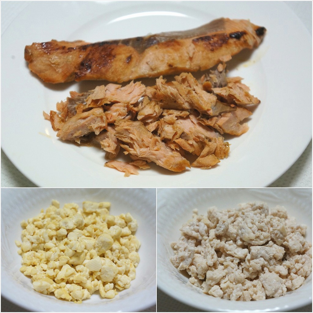 鮭とお豆腐と鶏ムネひき肉を炒めました。