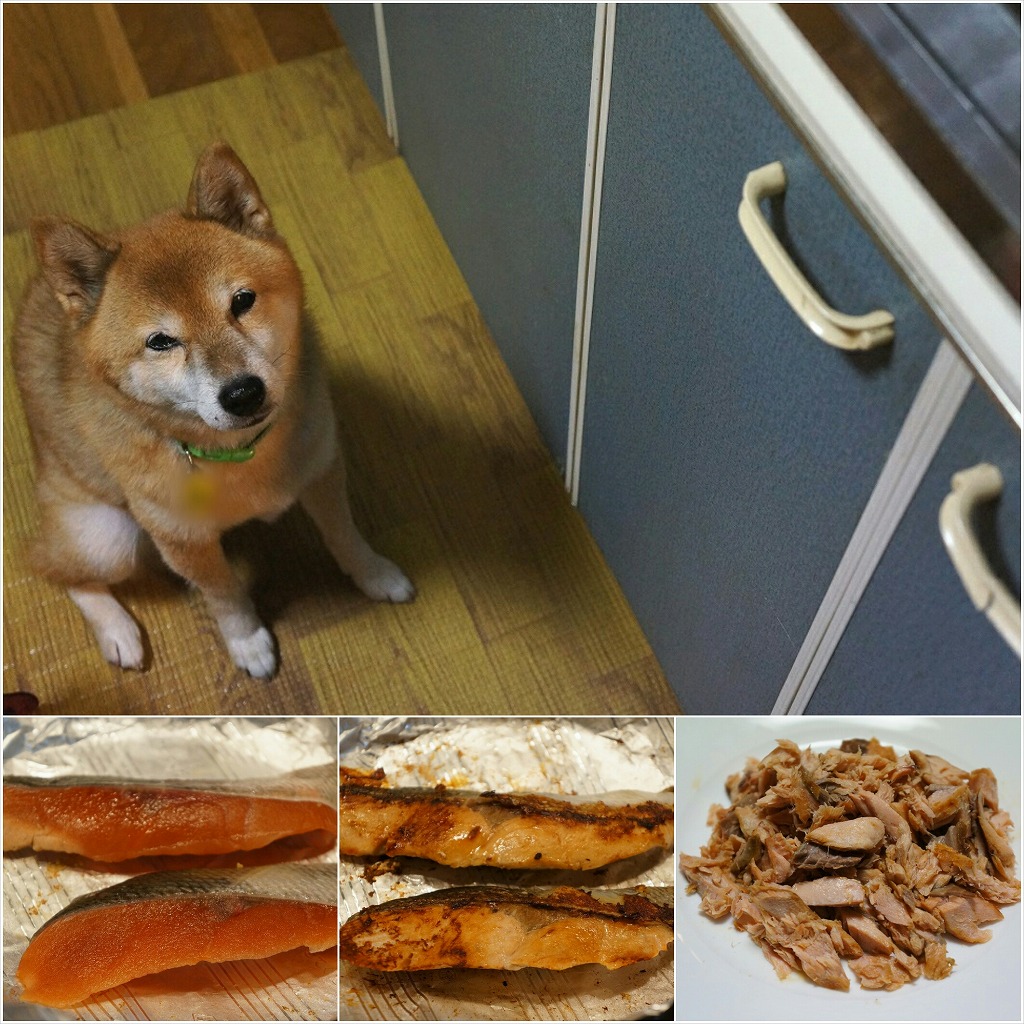 生鮭を焼いていたら、さっそくわさびが足元に待機。