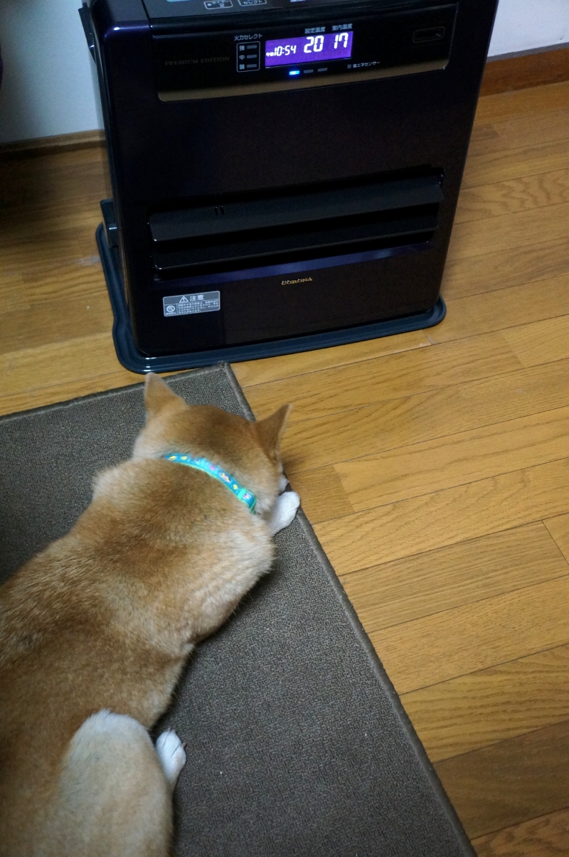 ストーブの前を陣取っています。