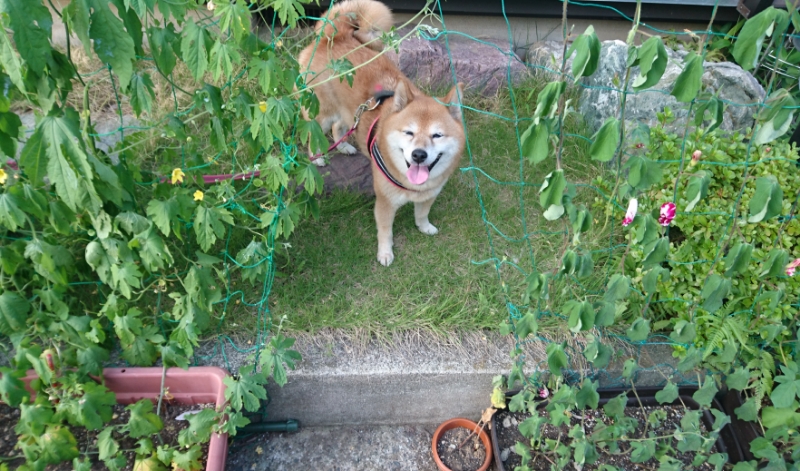 夕方のお散歩の時には、もうゴーヤたんも朝顔も、