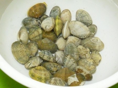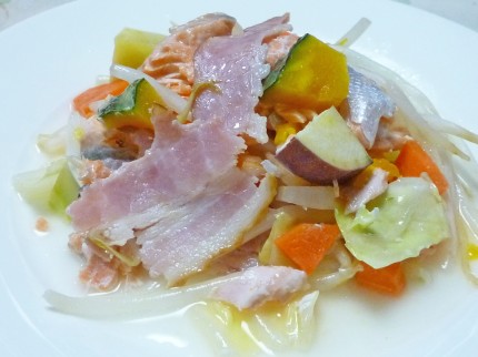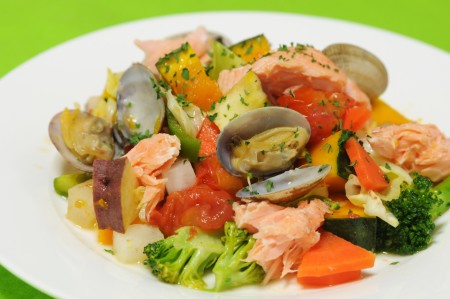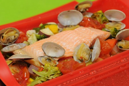 野菜をしき、鮭を置き…アサリとプチトマトを…