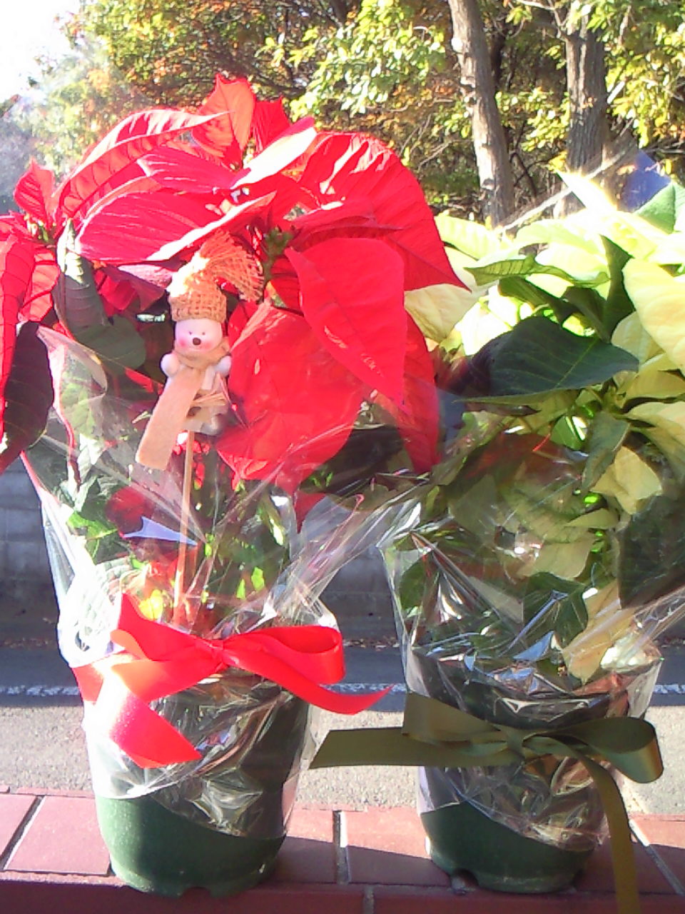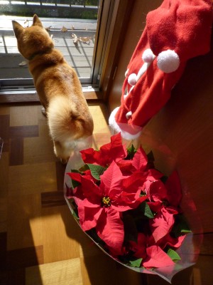 おお~ポインセチアに目がいきそうになるも、ちらちら(でもないか、堂々と)見えるサンタチックなお衣装。 どなたのかしらん??