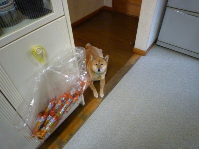 ちなみに廊下でお利口さんに待ってるわさびの手前にある食器棚に引っ掛かってる「うまい棒お徳用袋」は誰が食べてるんだろう~。