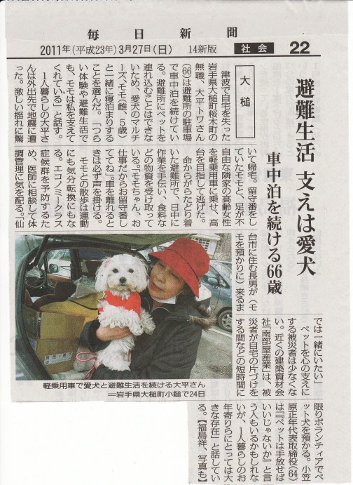 ・被災ペット、行き場なく 動物病院は満杯 岩手日報3/22