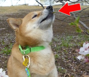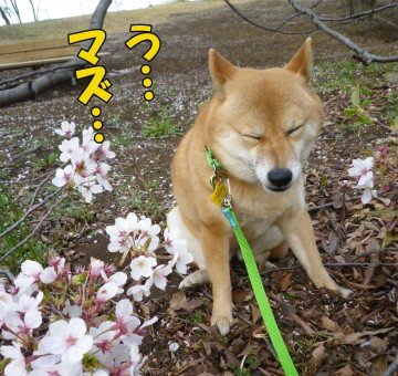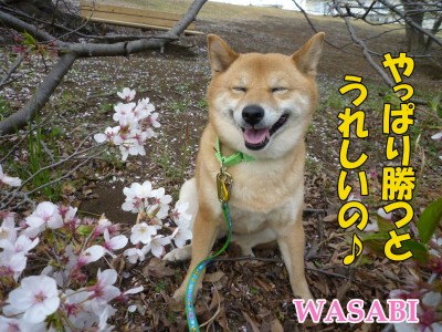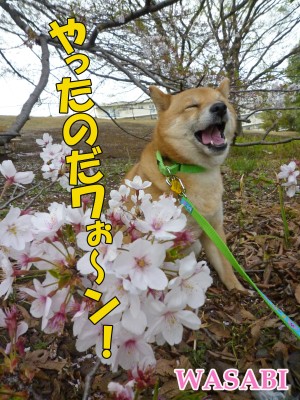 桜のお花見ショットがとてもなごみますが・・・枝がなんでそんな地面に近い??も、もしや、だれか関係者様が枝の付け根に全体重をかけて枝を下向きにしてわさびが食べやすいように(いや、愛でやすく)してる??笑