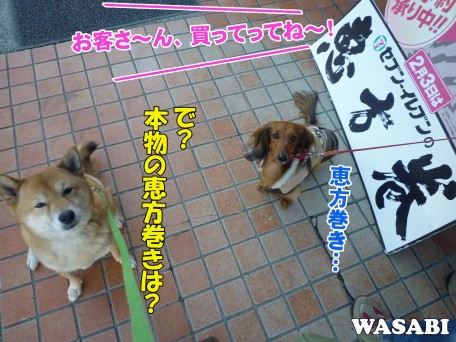 恵方巻きの穴、いいですね〜!!さぞ?わさびちゃんも半分あきらめ?