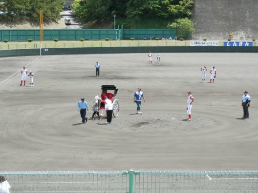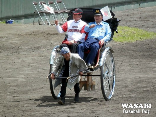 マウンドで人力車から降りる市長さんと警察署長さん…