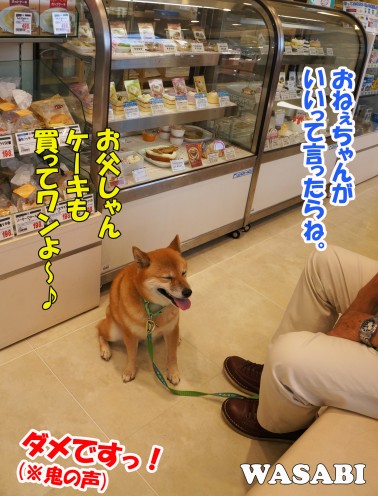 わんこケーキのショーウインドウ前で おねだりするわさび