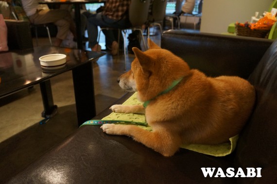 革張りソファでVIP席、堂々たる くつろぎっぷりのわさび。