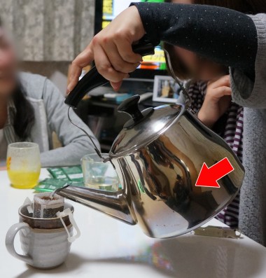 熱湯の入っている重いヤカンを持ち上げ、