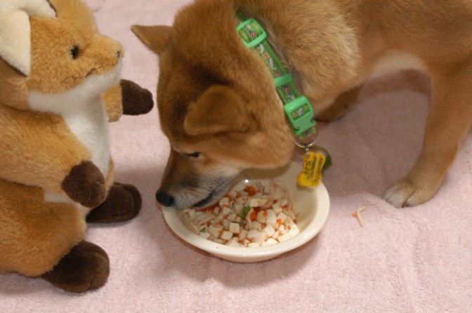 お皿から、ささみがこぼれた…でもちゃんと拾ってた。