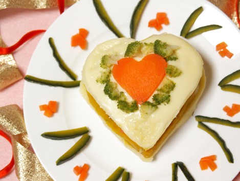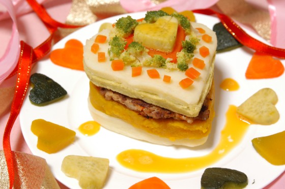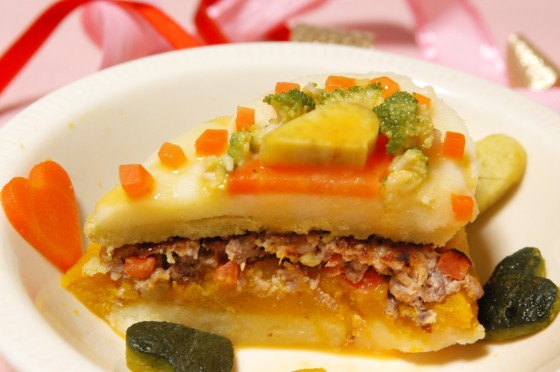 下から、じゃがいも→かぼちゃ→肉→さつまいも→じゃがいも)