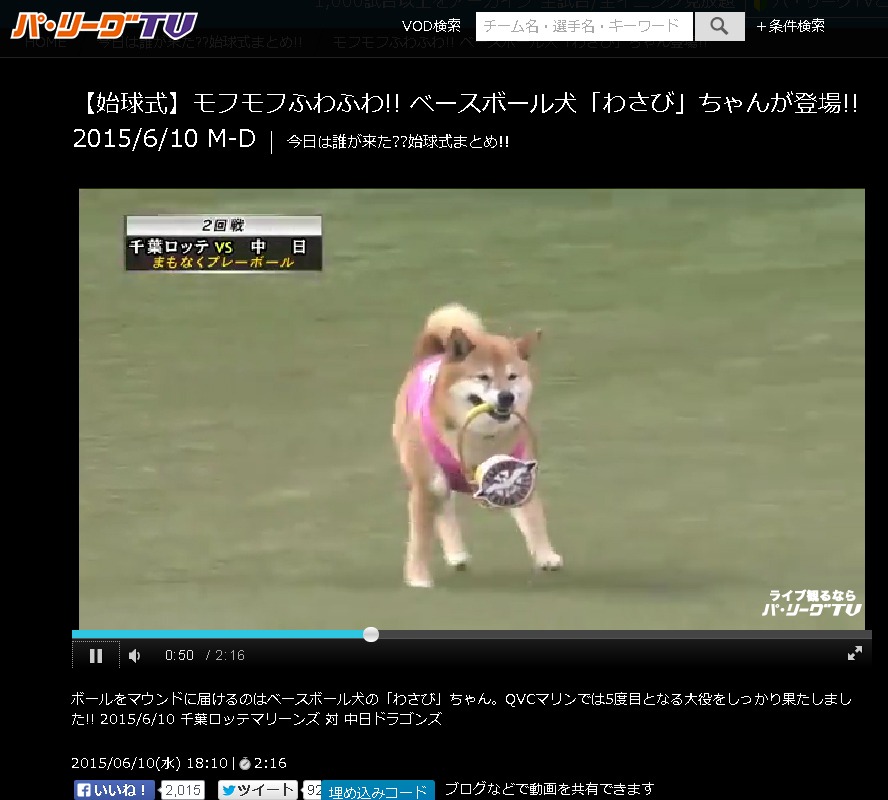 ベースボール柴犬のわさびちゃんが始球式に登場 2015/06/10 M-D