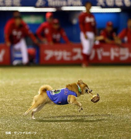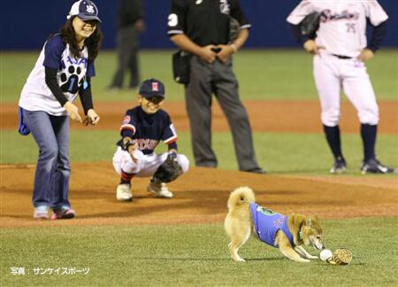 ベースボール犬のわさびちゃん、優勝の燕・つば九郎に祝福のビール贈る