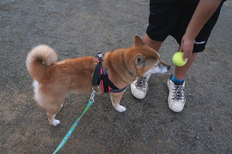 テニスのお兄ちゃんにもらったボール、お外用なのに、