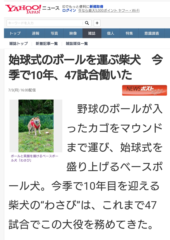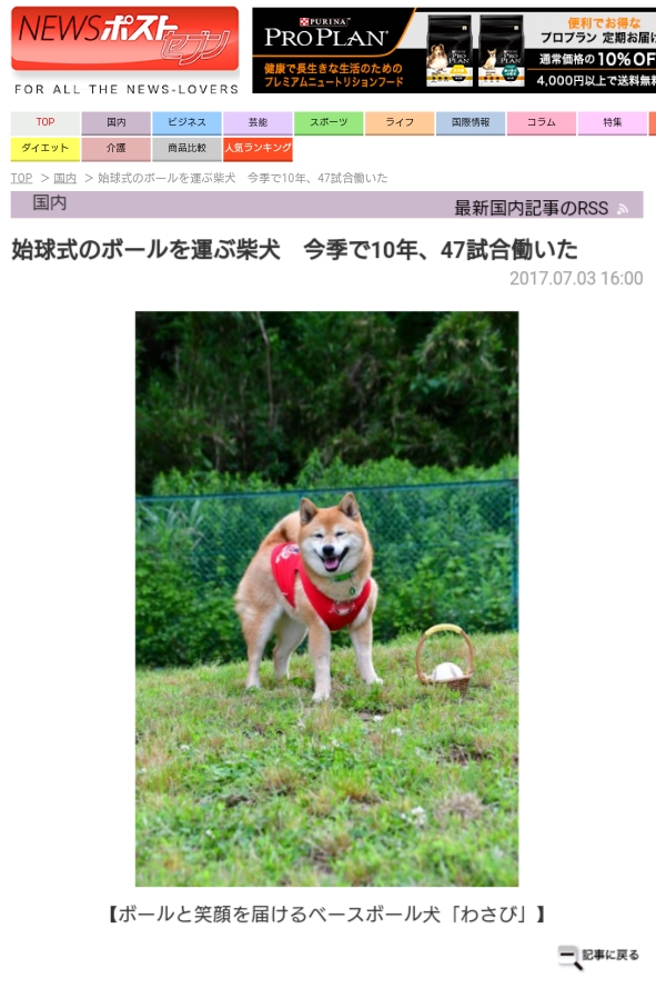 ★『女性セブン』2017年7/13日号「はたらくどうぶつたちvol.86」ベースボール犬わさびの特集記事